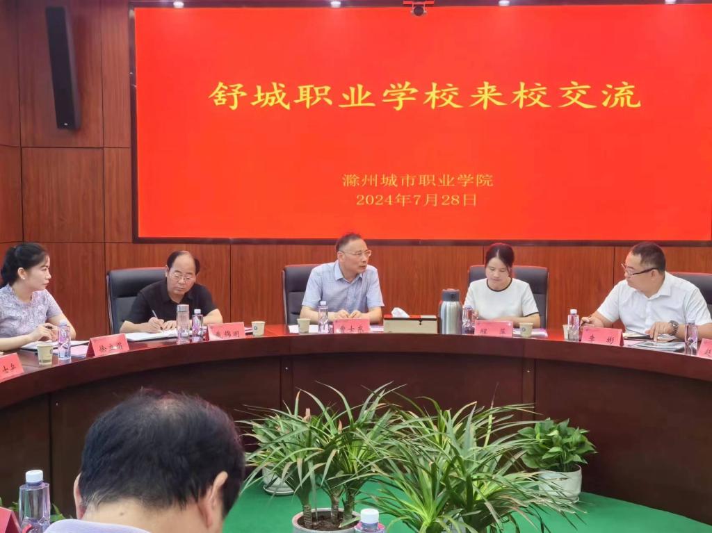 7月28日,舒城职业学校党政班子、骨干教师和班主任等一行30多人到我校考察交流。校党委委员、副校长曹士东,办公室、教务处、招生就业处和五院负责人参加交流会。
