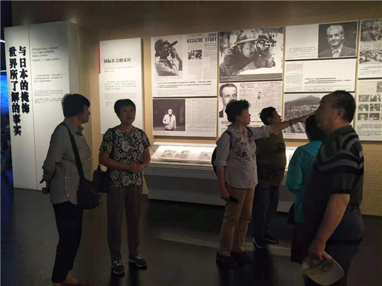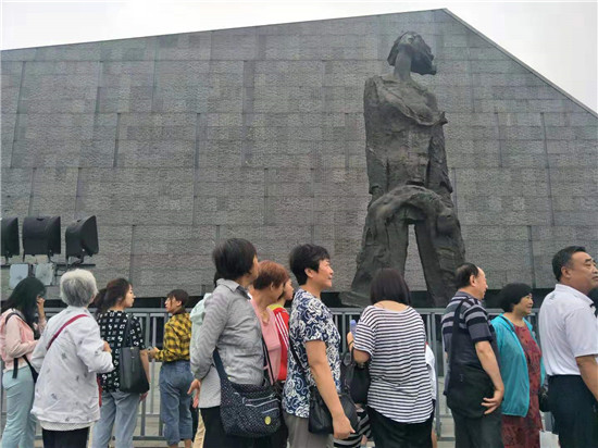 纪念馆外,手捧婴孩尸体的“母亲的召唤”雕塑令人触目惊心,进馆后横亘于眼前的三十万遇难者名单更让人悲戚万分,“万人坑”遗址等场所再现了不堪回首的人间炼狱……。老党员们认真听取讲解员的讲解,默默悼念劫难中的罹难同胞们,不时停下脚步,看着眼前血腥惨烈的图片和影像,被以生与死、悲与愤为主题的悲苍景象所震撼。