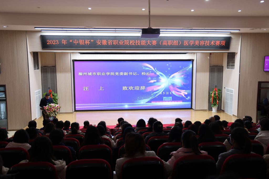 汪上致欢迎辞。他代表学校向出席仪式的各位领导、嘉宾、裁判员和各参赛队代表表示热烈欢迎。他指出,安徽省职业院校技能大赛是全省兄弟院校互学互鉴、共同成长的重要平台,引领全省职业教育发展的方向,有力推动专业建设与产业发展对接、人才培养与社会需求对接。医学美容技术赛项旨在通过竞赛机制检验职业院校医学美容技术专业教学改革成果,加快推进专业教学改革,全面提升医学美容技术专业人才培养质量。作为东道主,我们将严格执行赛事各项规定和要求,确保大赛公平、公正、公开,同时竭力做好各项服务保障工作,为全体参赛选手提供安全有序的竞赛环境。