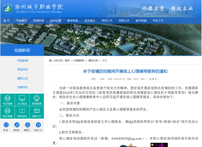 畅通网络渠道,架起师生互动的“连心桥”。2月1日,学院疫情防控学生工作组及时发布《关于疫情防控期间开展线上心理辅导服务的通知》,正式拉开战“疫”序幕。学院心理健康教育中心8位专兼职老师积极通过网络在线咨询、电话心理援助、电子邮箱留言咨询等方式为广大师生提供防疫期间的心理援助服务。8位老师不分昼夜,全天候参与值班,聚焦疫情中常见的心理困境,帮助师生分析自我心理反应、了解自身心理状态,提供有效调节身心问题的方法。除稳步开展线上心理咨询外,学院积极做好停课不停学各项工作,所有心理健康教育方面的课程如期上线,为了确保线上心理健康教学顺利推进,学院疫情防控教学工作组积极协助任课教师提前布置课程的运行方式和时间节点,安排各班级心理委员了解学生心理动态,提高教学工作的针对性。与此同时,学院还认真组织学生收看教育部思政司及高校心理委员工作协作组开设的在线心理健康教育讲座,切实为广大师生的心理健康保驾护航。
