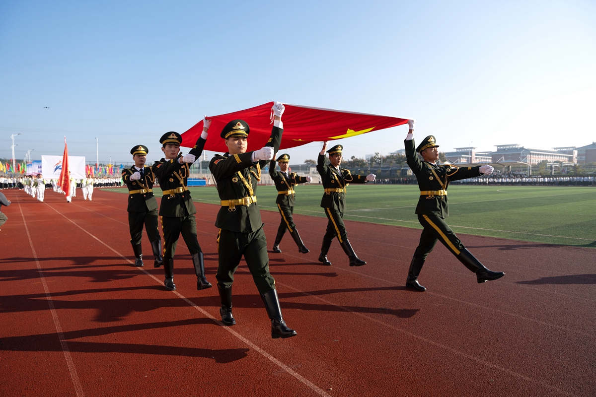 伴随着慷慨激昂的《运动员进行曲》,迈着铿锵的步伐,威武庄严的国旗方阵、形式多样的运动会展板方阵、激情昂扬的彩旗方阵、各学院代表队依次走过主席台接受检阅,整个入场过程热烈充满激情,处处诠释着体育的魅力。入场方队表演结束后进行了庄严的升国旗仪式。