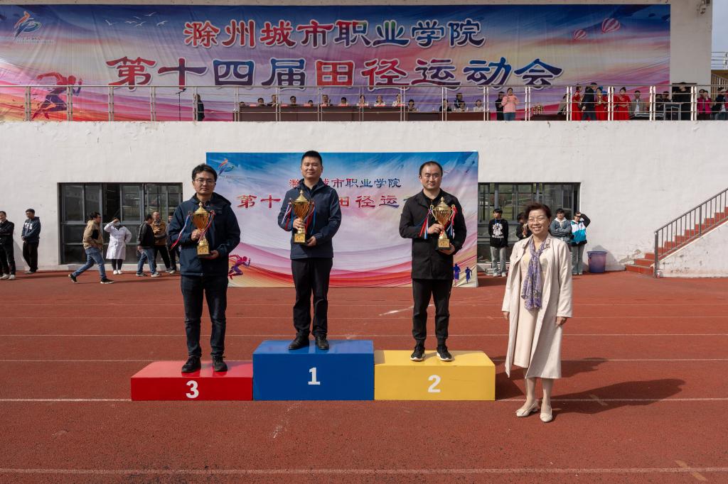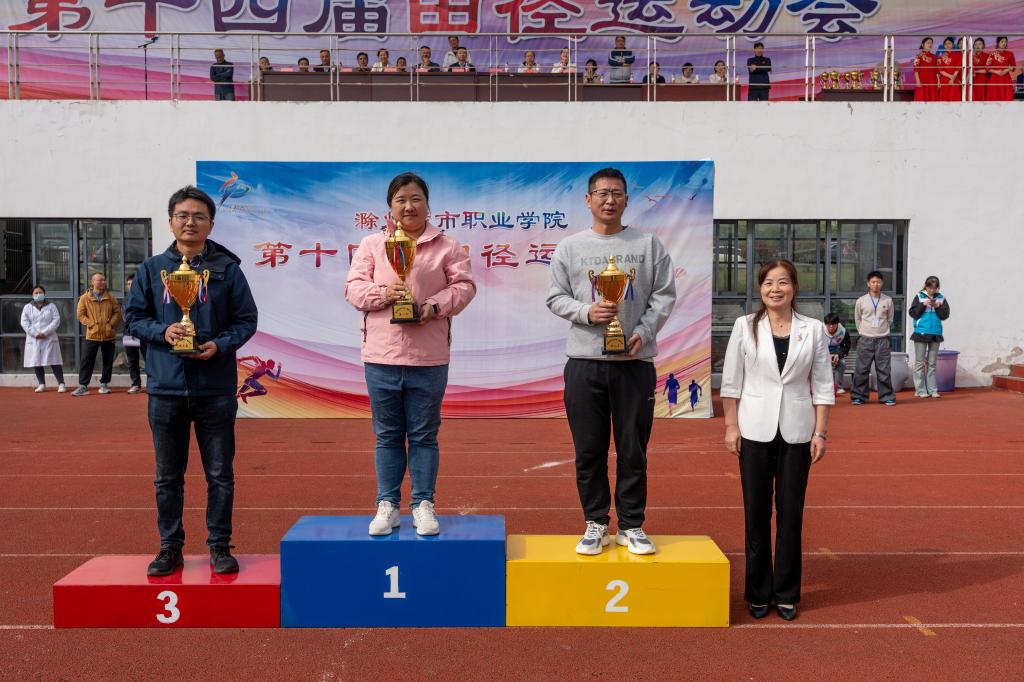 大赛总裁判长刘爱宣布本次田径运动会团体获奖情况,马克思主义学院和体育教学部分工会获得教职工广播操第一名;护理学院以285分总成绩摘得学生组团体总分第一名,教育学院和管理与信息学院分别获得第二、三名;管理与信息学院获得学生组男子团体总分第一名,教育学院获得学生组女子团体总分第一名。校领导为教职工组广播体操、学生组团体总分、学生组男子团体总分、学生组女子团体总分前三名获奖代表队颁发奖杯。