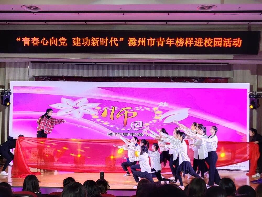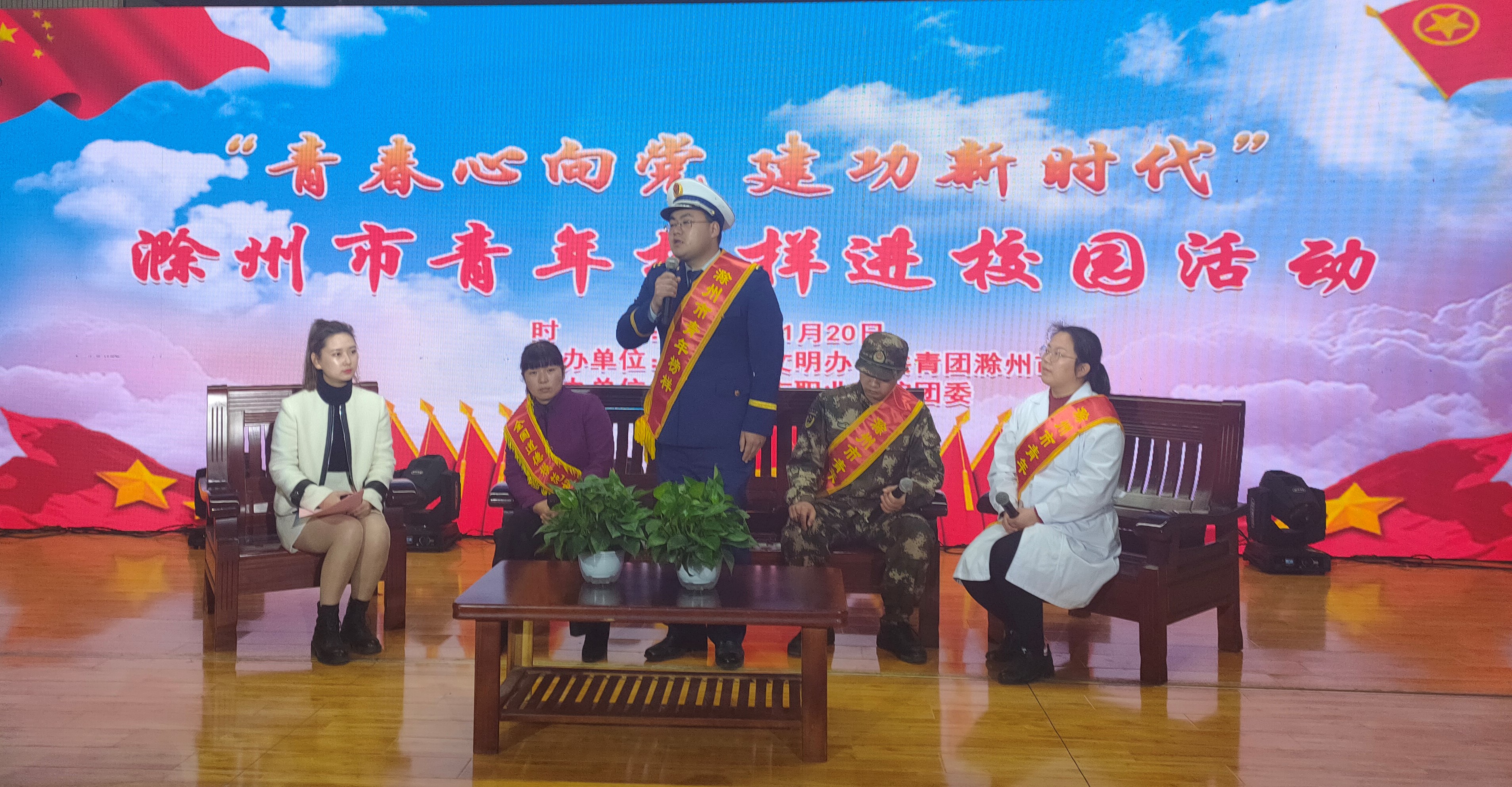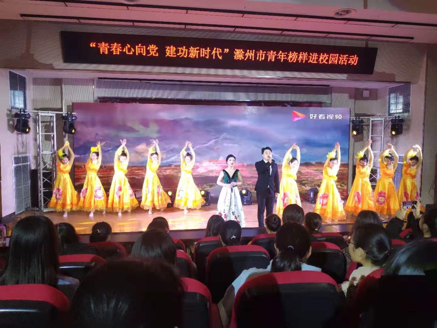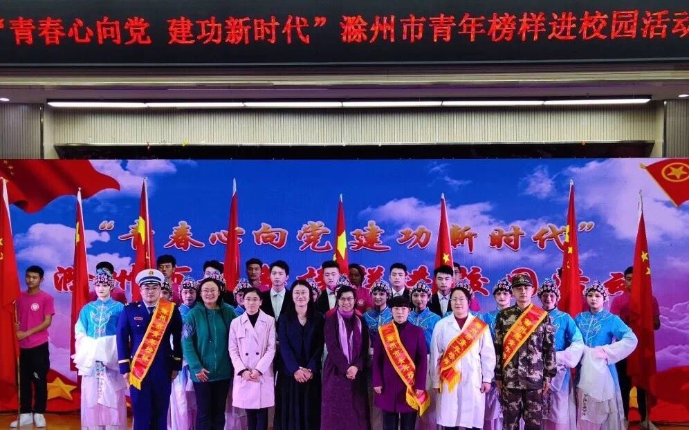 为树立典型,增强对学生的榜样教育,在全院学生中创设积极向上的学习氛围,激发学生勇于争先的进取精神,11月20日,“青春心向党 建功新时代”滁州市青年榜样进校园活动”在我院四楼报告厅隆重举行。学院党委副书记牛春雨、团市委副书记魏倩霓、基础部主任何大海、市委宣传部宣教科科长马其平、团市委宣传部部长张勇、教体局团工委书记郝艳艳、院团委书记周慧、团委副书记徐昌灿以及我院师生代表300余人共同观看了本次活动。