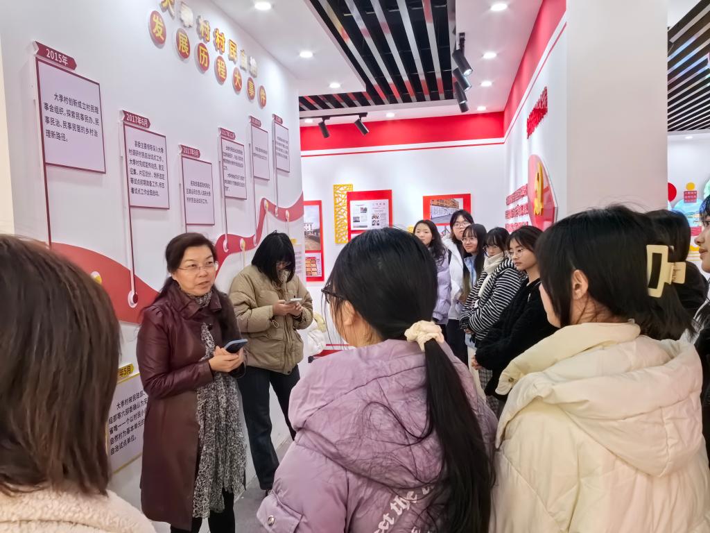 在全椒县党建引领乡村治理主题馆、石沛镇乡村振兴馆,牛春雨结合《习近平新时代中国特色社会主义思想概论》课教学内容,给学生详细讲授基层群众自治制度在乡村治理中是如何运行和实践的,人民群众在基层党组织领导下是如何广泛开展议事协商,实现民事民议、民事民办、民事民管,确保小矛盾小问题不出村,以乡村治理推动乡村振兴的。