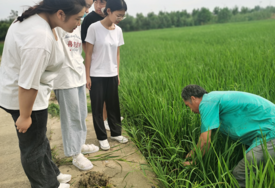 在滁州市农业科学研究院刘淼才主任的带领下,大家来到了黄圩村水稻试验基地,了解了水稻试验基地的基本情况、水稻的种植和生长过程等知识。正在大家感叹粮食来之不易之时,远远看到正在拔草的农民。刘淼才说,我们采用人工拔草,没有使用除草剂,这样既能保证收获健康安全的粮食,又能在除草的同时疏松土壤,增加土壤的透气性,减少农药残留,也有利于水稻的生长,为收获提供保障。大家听后便主动提出帮忙拔草,也想为本地水稻科研贡献自己的一份力量。但是从未下过田地的学生们哪里有水稻田里拔草的经验,于是,学生们便虚心地听专业人员讲解了水稻和杂草的区别以及拔草的正确方法。