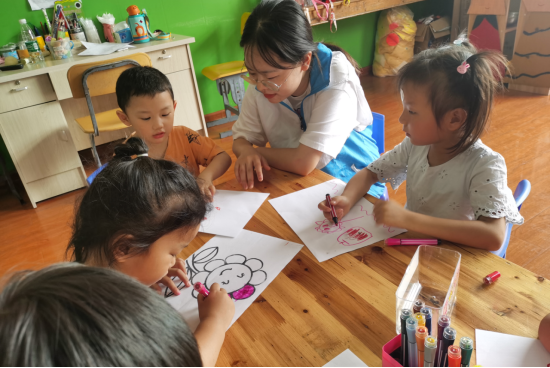 虽然天气炎热,但志愿队学生的热情不减,自始至终他们都没有一句怨言,通过短暂的相处与村民们建立了深厚的感情,赢得了村民们的一致好评。随后,志愿队的成员们前往乌衣阳光幼儿园进行支教活动,带小朋友唱歌、画画,帮助没扎好小辫的小朋友重新扎小辫,给孩子们带去关爱和陪伴。