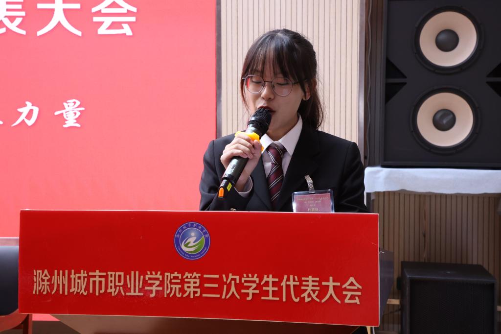 张文鑫同学代表滁州城市职业学院第二届学生会作了《勇挑时代担当,绽放青春风采,为建设技能型高水平大学汇聚磅礴青春力量》的工作报告。报告全面回顾了过去一年学院学生会在思想引领、组织建设、校园文化、社会服务、学生权益等方面所做的工作,并围绕学院中心工作明确了下一年的工作任务。