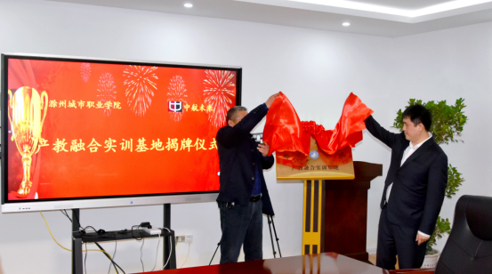 滁州城市职业学院副院长施向阳与集团董事长刘永代表双方共同为“滁州城市职业学院产教融合实训基地”揭牌,校企双方领导合影留念,仪式圆满结束。