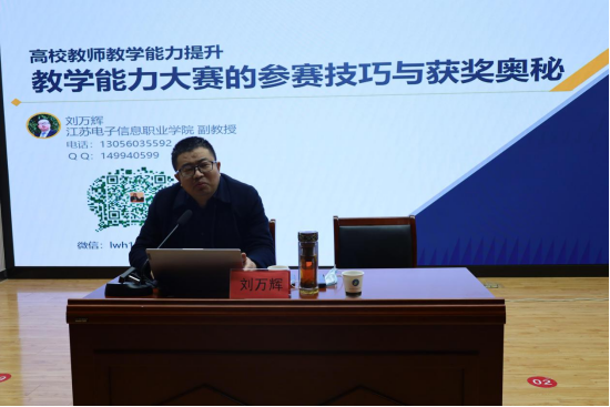 培训会上,江苏电子信息职业学院刘万辉教授作了题为“教学能力大赛的参赛技巧与获奖奥秘”专题讲座。刘教授自下而上,从参赛教师的视角,以参赛实施报告和视频两项核心材料为主线,浅入深出,以小见大,拨云见日,为教师们提供了非常专业的指导培训。刘教授的讲座充满激情,形式活泼,专业性、指导性、实用性极强,极大地激发了广大教师参赛的欲望和激情,提振了信心。