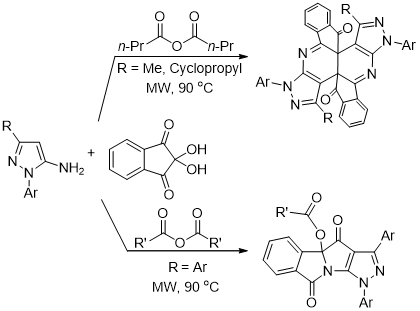 该论文从茚三酮水合物和氨基吡唑出发,通过控制氨基吡唑C3位的取代基,选择性合成2,6-萘啶和吡咯嗪衍生物(图3)。在构建2,6-萘啶骨架时,涉及双[3 + 2 + 1]杂环化反应,通过6p电环化过程生成了C-C键和C-N键。在构建吡咯嗪骨架时,涉及[3 + 2]和[4 + 1]杂环化反应,提供了探究双环化反应的新视角。以上两种骨架均具有很好的生物活性,在医学上会有广泛的应用。