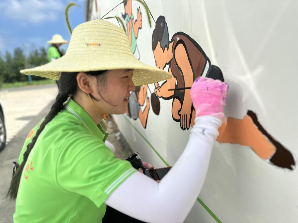 图为教育学院暑期社会实践团在炎热的天气下为美丽乡村墙绘