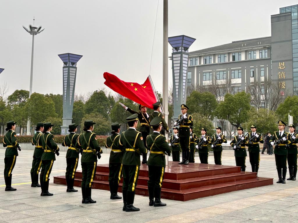 国旗护卫队迈着整齐有力的步伐,护卫着五星红旗走向升旗台。全体师生肃立,齐声高唱《义勇军进行曲》。随着激昂的旋律,五星红旗在晨光中冉冉升起,迎风飘扬,象征着中华民族的团结奋进和伟大复兴。这一刻,爱国之情在每一位师生心中油然而生。
