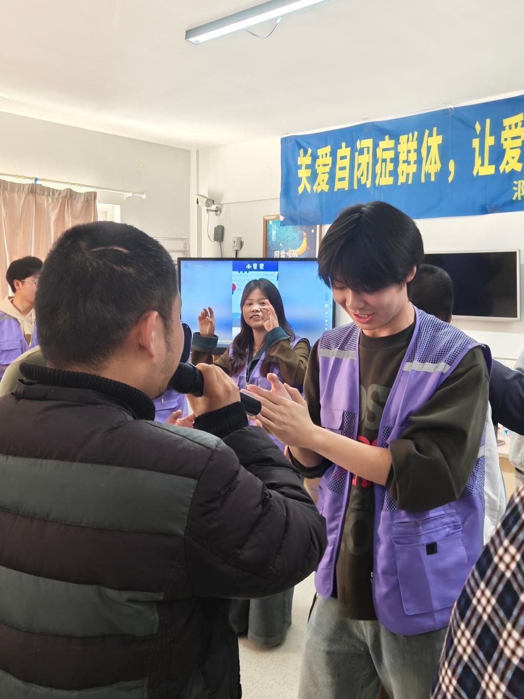 随后进入了分组练习阶段。音乐生和自闭症患者被分成多个小组,每组由1名音乐生带领1名患者。在小组内,演唱和舞蹈练习有序开展。音乐生们根据每个患者的特点和进度,进行一对一的指导和帮助。在这个过程中,大家相互交流、相互鼓励,现场充满了温馨和谐的氛围。