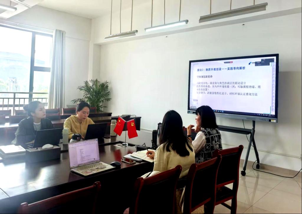在交流互动环节,课程团队围绕邰教授提出的“材料投放三原则”(层次性、开放性、动态性)和“主题环境创设三贴近”(贴近生活、园所文化、季节节点)展开深度探讨。以“超市主题”跨区域联动设计为例,团队现场探讨了阅读区、数学区、建构区与角色扮演区的协同教学场景,探索如何通过项目化学习提升幼儿综合能力。