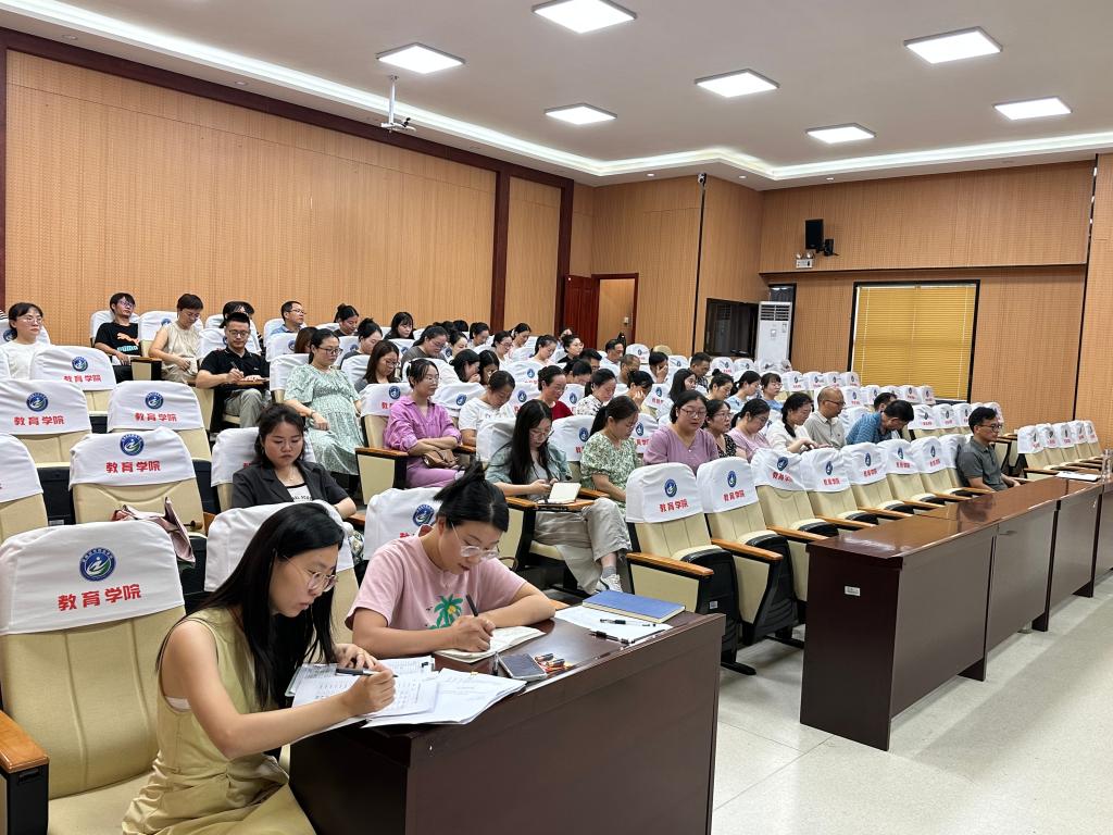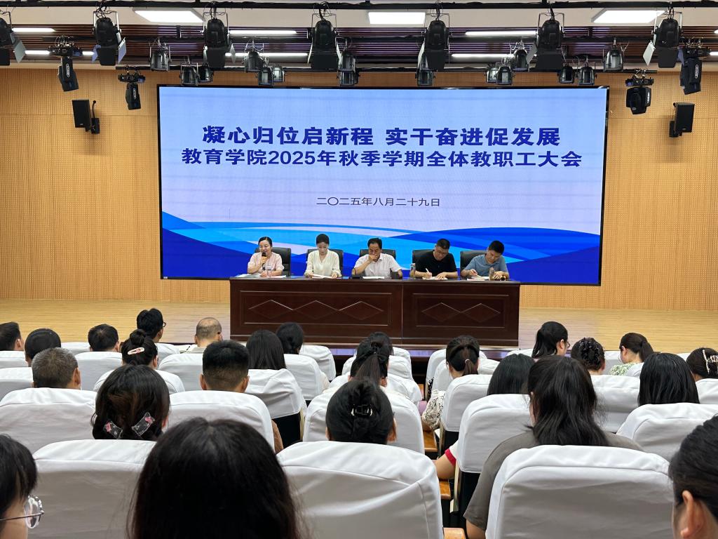 为统一思想、凝聚共识,全面部署新学期各项工作,8月29日上午,教育学院在报告厅召开2025年秋季学期全体教职工大会。会议旨在动员全体教职工以饱满热情和务实作风投入新阶段工作,共同推动学院教育教学高质量发展。教育学院党总支书记刘亮、院长徐立娟、副书记陈立超、副院长刘明辉、袁远出席会议,会议由袁远主持,教育学院全体教职工参加会议。