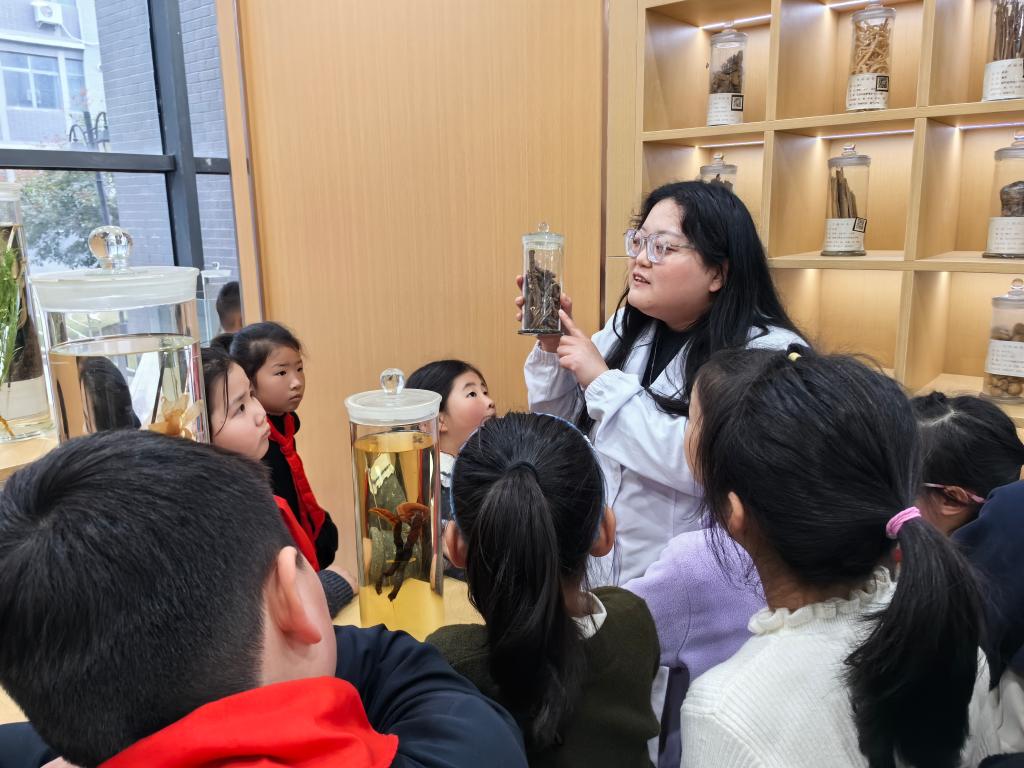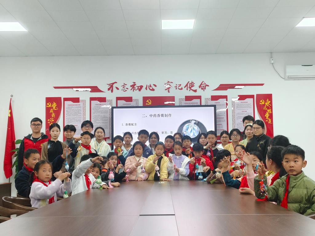 离开镜园,孩子们在党员志愿者的带领下来到生物医药学院中医药展厅。在讲解员的引导下,他们近距离观察各类中药材标本,了解传统制药器具和创新中医药制品,感受中医药文化的博大精深。最让孩子们兴奋的是亲手制作中药香包环节。在专业老师指导下,孩子们从药材装填到制作香包,每一步都认真专注,党员志愿者在一旁耐心协助,共同在动手实践中体会传统手工艺的乐趣。