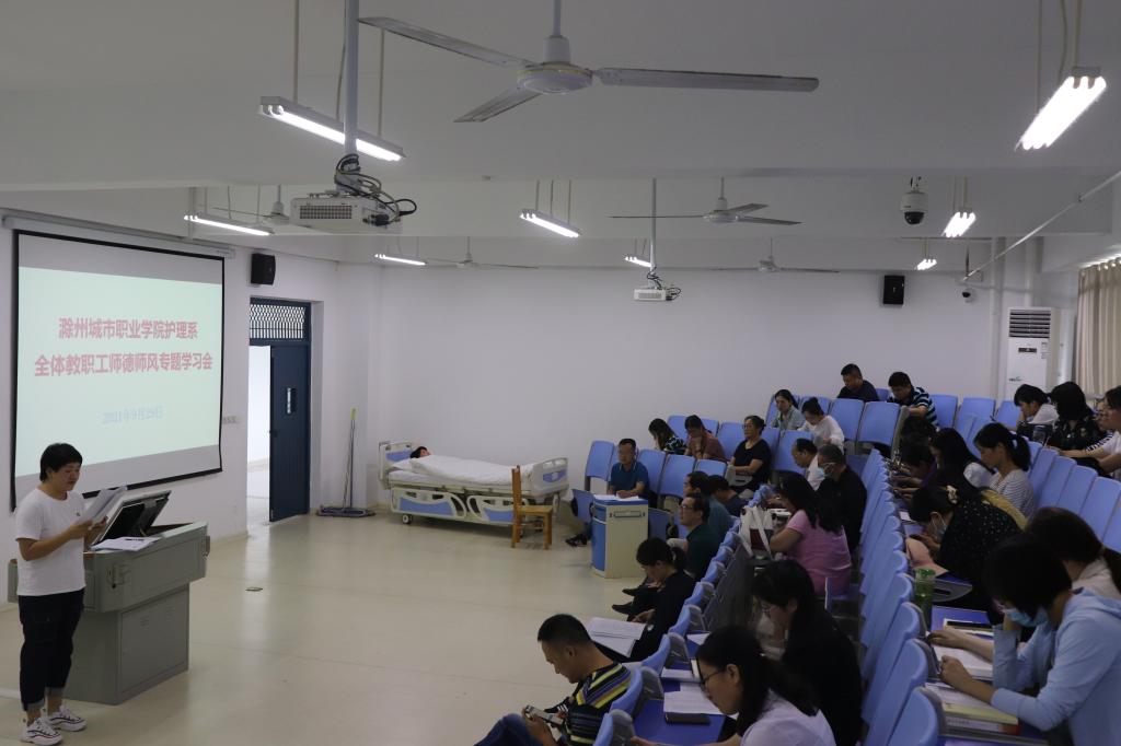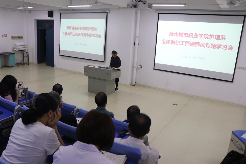 9月29日下午,护理系在B3-211召开师德师风专题学习会,学习贯彻“全省教育系统教师思想政治和师德师风建设视频推进会”精神。会议由系主任章正福主持,系全体教职工参加会议。
