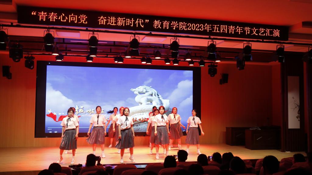 入团仪式结束后,“五四”文艺汇演在陶欣湲演唱的歌曲《骄傲的少年》中拉开序幕,随后赵雨薇演唱歌曲《一路生花》,两首歌曲都精彩展示了新时代青年的蓬勃朝气和奋发向上的精神面貌,由20小教初专3班朗诵的《错位时空》展现了青年的担当和爱国情怀,欢快优美的舞蹈《我们都是追梦人》展现了青年人的风采和对实现中国梦的期盼。