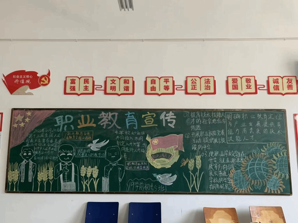 为丰富校园文化建设,营造尊重技能、崇尚技能、人人学习技能、人人享有技能的校园风尚,同时让广大同学了解职业教育、热爱职业教育,在职业教育活动周启动后,教育学院充分利用各宣传阵地,广泛开展职业教育宣传,营造了职业教育大有可为、大有作为的良好氛围。同学们创作的黑板报以图文并茂的形式呈现于创作中,形象、全面地展现了专业特色,大力弘扬工匠精神,为职业教育活动周增添了别样的色彩。