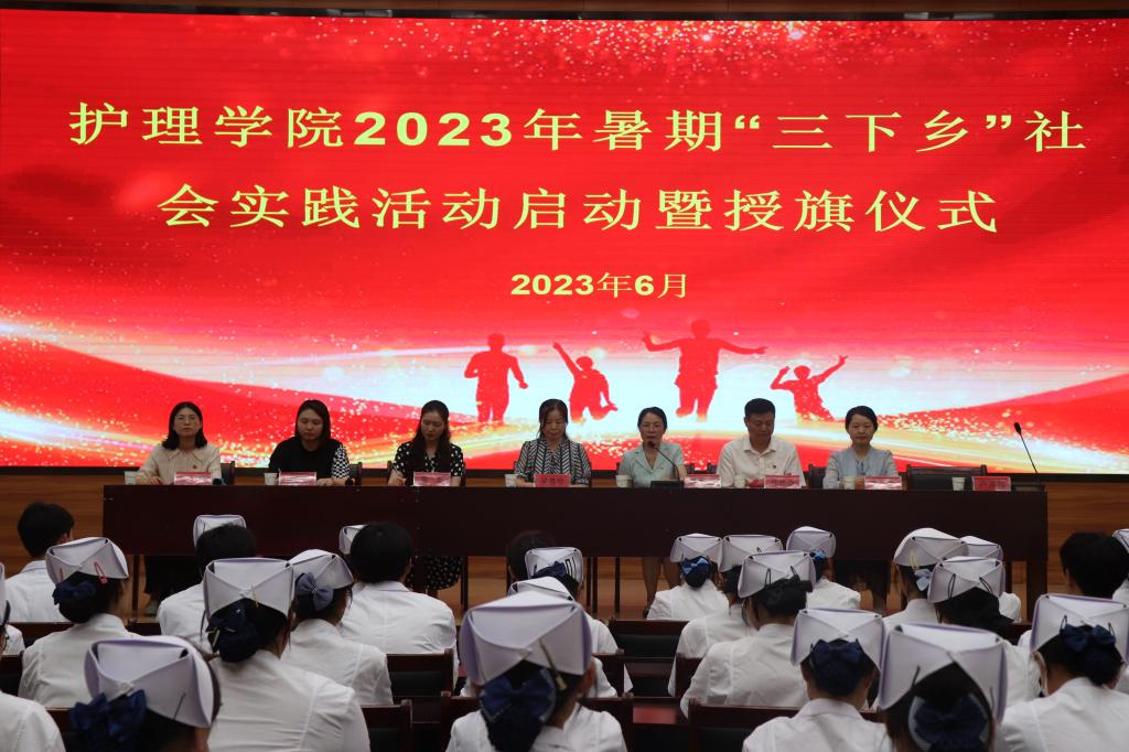 为深入学习宣传贯彻党的二十大和二十届一中、二中全会精神,引导和鼓励青年学子把课堂学习和社会实践紧密结合起来,坚定不移听党话、跟党走,上好与现实相结合的“大思政课”,6月14日下午,护理学院在校第二学术报告厅举行2023年暑期“三下乡”社会实践活动启动暨授旗仪式。校党委委员、副校长吴惠珍,护理学院党总支书记蔡季秋、院长金虹,腰铺镇梅铺社区党委书记孙林余、校团委书记陈婷婷、腰铺镇梅铺社区居委会副主任季凤、护理学院党副总支书记卢齐伟和辅导员代表、学生代表近150人参加启动仪式。仪式由护理学院团总支书记王艳主持。