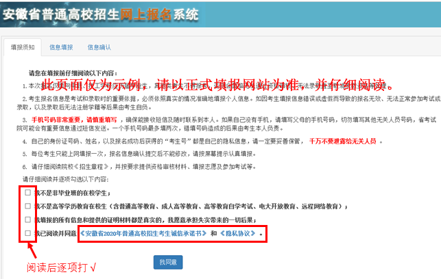 (1)请仔细阅读须知,点击并阅读《安徽省2020年普通高等学校招生考生诚信承诺书》和《隐私协议》,确定本人符合报名条件后,依次确认并勾选承诺内容。
