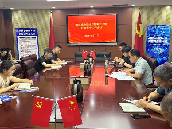 为了深入落实国家网络安全宣传周的文件精神,提升全校师生的网络安全意识和防护技能,加强网络安全防护保障和应急处置能力,营造健康文明的校园网络环境,9月11日下午,滁州城市职业学院2024年第三季度网络安全工作会议在图文中心第四会议室召开,网络安全与信息化领导小组办公室全体成员及各部门、院部网络安全管理员参加会议,会议由网络信息中心主任钮群主持,校党委委员、副校长曹士东出席会议并讲话。