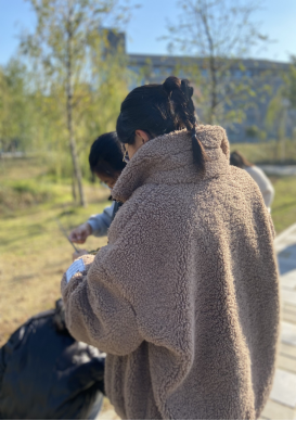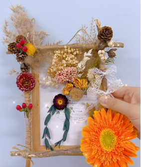 活动现场我们的同学们奇思妙想,动手制作了一个个树叶作品。用收集到的落叶在白纸上作画,用捡来的树枝制作手工艺品,平平无奇的白纸,普普通通的树枝,但是配上我们同学们别出心裁的创作,树叶灵动的姿态就展现在我们眼前。现场我们教同学们制作干花,将鲜花一枝枝修剪好,裁剪下形状完整的鲜花放入压花工具内,再铺上吸水纸,耐心的等待几天干花就制作好了,鲜花变成干花的过程就像是美丽永恒的过程。