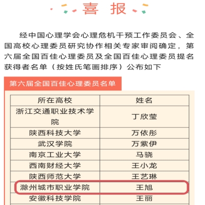11月1日至3日,由中国心理学会心理危机干预工作委员会主办,中南财经政法大学承办的第十八届全国高校心理委员工作研讨会暨朋辈辅导论坛、第六届全国百佳心理委员论坛在武汉中南财经政法大学召开。我校教育学院21小教初专3班王旭同学在全国近400名高校心理委员中脱颖而出,荣获第六届“全国百佳心理委员”荣誉称号,当选为第六届全国百佳心理委员论坛主席团成员,并参加全国高校心理委员学校特色工作交流,这是我校学生首次荣获此殊荣。