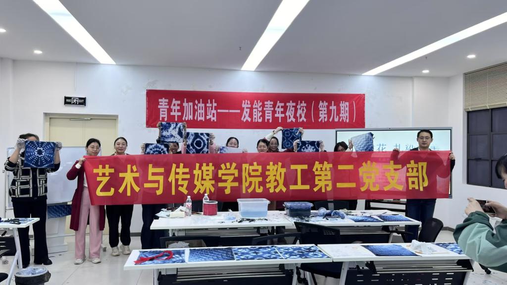 为更好地服务社会,发挥教师党员专业优势,丰富“丹青绘宏图”党建品牌活动,艺术与传媒学院教工第二党支部于11月6日晚上,深入滁州市南谯区龙蟠街道发能社区指导青年夜校扎染活动,为青年夜校以及社区居民带来了一场别开生面的文化活动。教师党员们一到现场,便立刻投入到了紧张而有序准备工作中。他们精心布置了教学场地,准备了各种扎染所需的材料和工具,并细心地向居民们讲解了扎染的历史渊源、艺术特色以及制作流程。党支...