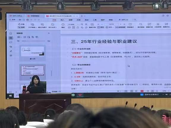 为了帮助大学生了解行业发展新趋向,提高就业创业信心和动力,近期,艺术与传媒学院举办了2025届大学生就业创业宣讲报告会。会议邀请了滁州吉乐琴行总经理赵园作专题宣讲。艺术与传媒学院音乐系主任霍雪娇主持宣讲会。赵园经理围绕就业形势、面试技巧、职业经验讲解,分析行业就业形势,强调面试要点,分享经验案例,提供了许多有价值职业资源。本次宣讲会进一步增强了我院学生就业信心、明确职业方向,是迈向成功职业的重要一...