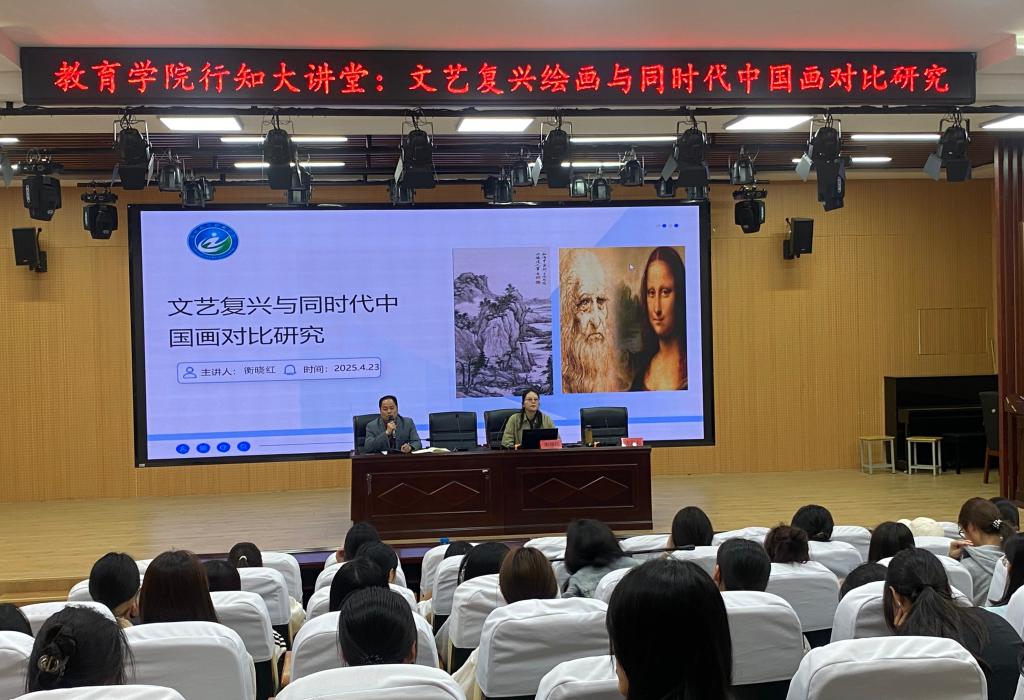 为强化美育教育,探索“五育融合”新路径,教育学院于4月23日在学院报告厅举办行知大讲堂,带来了一场以“文艺复兴绘画与同时代中国画对比研究”为主题的报告。本次讲堂由衡晓红老师主讲,教育学院党总支书记刘亮出席活动并主持。活动中,主讲人衡晓红凭借深厚的专业知识与丰富的研究经验,以生动形象的语言,从创作背景、艺术风格、表现手法、文化内涵等多个维度,对文艺复兴绘画与同时代中国画进行了深入细致的对比分析。通过...