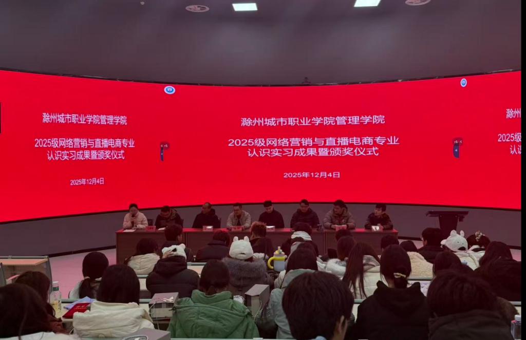 为总结实习成效、表彰优秀学子,管理学院于12月4日举办2025级网络营销与直播电商专业认识实习成果暨颁奖仪式。滁州市南谯区融媒体中心专题部主任杨槐、滁州市电子商务商会秘书长陈栋、直播基地负责人李想等企业嘉宾,与学院党总支书记陈兴旺、院长叶士舟、财贸管理系主任周旋、班主任刘洋及师生代表共同参会。会上,直播基地负责人李想首先介绍实习总体情况。本次实习自10月20日启动至11月29日结束,为期34天,在学院与滁州市电...