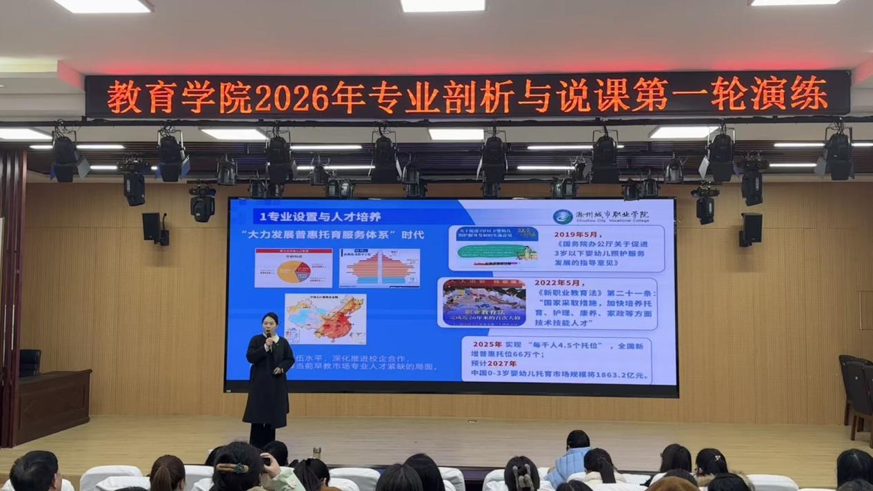为深化教育教学改革,优化专业建设布局,打磨优质课程体系,扎实推进办学能力评价工作,3月18日,教育学院在报告厅顺利开展2026年专业剖析与说课第一轮演练活动。本次演练聚焦小学教育与婴幼儿托育服务与管理两大专业,全体教师积极参与活动,为后续全面深化专业建设、提升人才培养质量筑牢基础。在专业剖析环节,婴幼儿托育服务与管理专业负责人戴月琦与小学教育专业负责人郎娟娟依次登台汇报。婴幼儿托育服务与管理专业作为国...