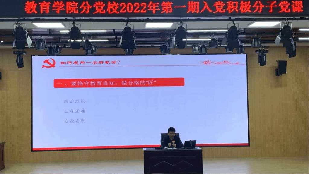 2022年4月25日下午7时,教育学院分党校在教育学院报告厅及C1南2203通过现场和直播的方式举办2022年第一期培训班第二讲。教育学院学生支部副书记陈立超带来主题为“不忘教育初心,增强教育情怀,助力师范生从‘匠’走向‘家’”的专题党课。在本次授课中,教育学院学生支部副书记陈立超从“匠”和“家”的区别导入本节课内容,鼓励学员们从教育良知、政治意识、看齐意识、专业素质、创新精神、大爱之心等方面努力成为一名优秀的...