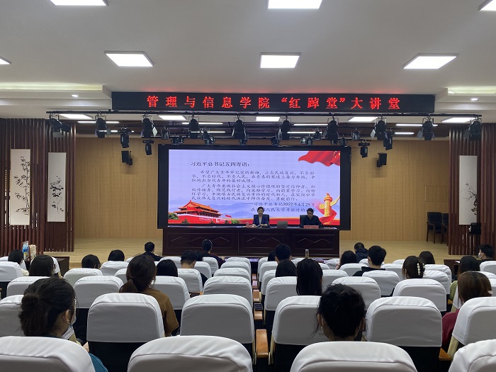 4月27日下午,校党委书记张志华莅临管理与信息学院“红踔堂”大讲堂,为我院师生作题为《从习近平总书记五四寄语看新时代大学生的“五育”与“五增”》的专题讲座。管理与信息学院党总支书记陈兴旺,全体辅导员(班主任)、各班班长、团支书、学习委员聆听了本次讲座。张志华以习近平总书记2022年4月25日在中国人民大学考察时的寄语“不负韶华,不负时代,不负人民,在青春的赛道上奋力奔跑,争取跑出当代青年的最好成绩”,“...