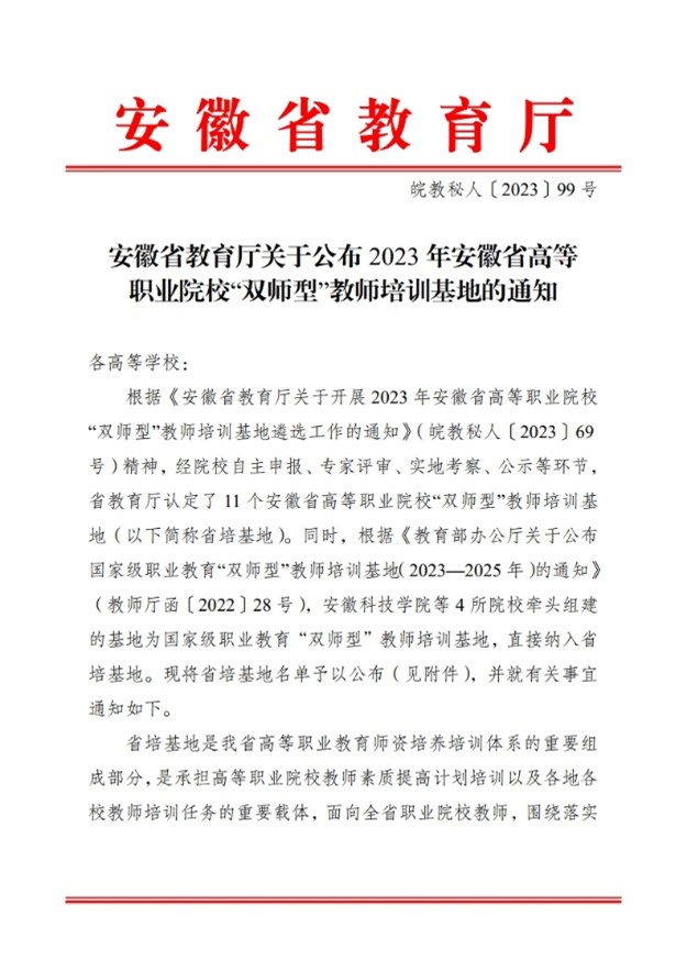 8月14日,安徽省教育厅印发《安徽省教育厅关于公布2023年安徽省高等职业院校“双师型”教师培训基地的通知》,我校获批安徽省高等职业院校“双师型”教师培训基地据悉,安徽省“双师型”教师培训基地可面向全省开展医药卫生大类护理类的“双师型”教师培训,是我省职业院校教师发展体系的重要部分,是双高建设目标达成的重要路径,是实现教师素质提升的重要载体。下一步,学校将紧紧围绕落实立德树人根本任务、对接新标准更新知...
