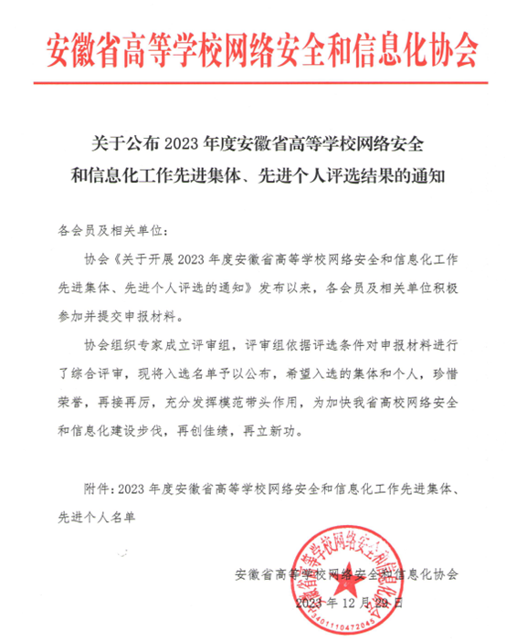 喜报!我校网络信息中心被评选为“安徽省高等学校网络安全和信息化工作先进集体”
