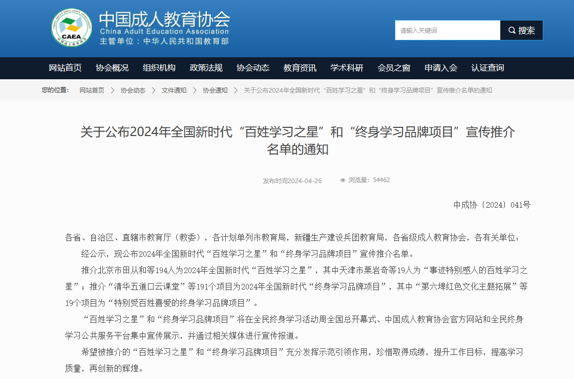 近日,中国成人教育协会公布2024年全国新时代宣传推介名单,推介194人为2024年全国新时代“百姓学习之星”、191个项目为2024年全国新时代“终身学习品牌项目”。我校老年大学推介的《“三贴近 三体现 三提升”老年教育项目》成功上榜,学校新添国字号品牌。祝贺!我校老年大学自成立以来,一直秉承“家门口的老年大学”的教育理念,致力于为老年朋友提供高质量的教育服务,累计开设了17个专业,线下学员参与课程教学近7000人次...