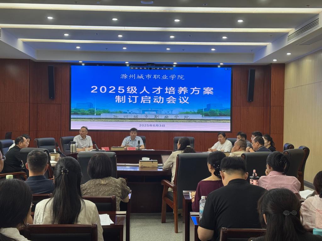 6月3日下午,学校在第五会议室召开2025级人才培养方案制订启动会议。校党委副书记、校长汪上出席会议并讲话,各教学院(部)院长(主任)、分管教学副院长(副主任)、教学秘书、专业负责人、教务处相关人员、数智研究中心工作人员等参加会议,会议由校党委委员、副校长曹士东主持。教务处解读了《滁州城市职业学院2025版专业(群)人才培养方案制订指导意见》《关于开展2025级专业人才培养方案和课程标准制(修)订工作的通知...
