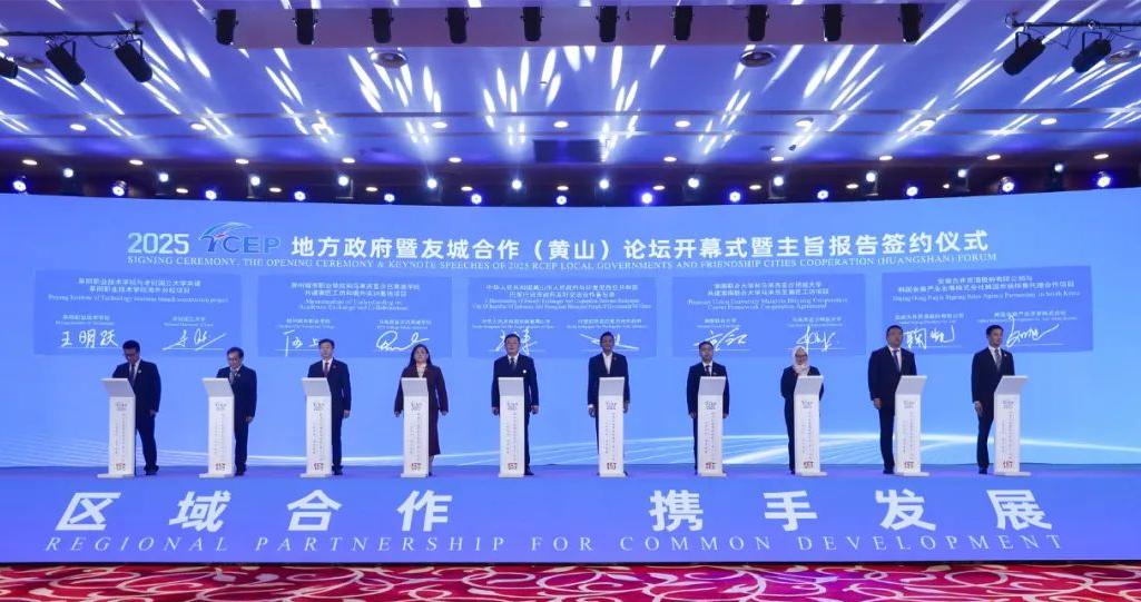 6月4日至6日,由中国人民对外友好协会和安徽省人民政府共同主办的2025RCEP地方政府暨友城合作(黄山)论坛在安徽成功举办。本次论坛以“区域合作,携手发展”为主题,全国人大常委会副委员长武维华致辞并宣布开幕,泰国副总理巴瑟视频致辞。RCEP各成员国及中国长三角地区、港澳地区工商界青年企业家、专家学者等200余名,围绕促进区域数智赋能合作与青年创业和RCEP框架下职业教育合作机遇相关话题开展对话交流。校党委副书记、...
