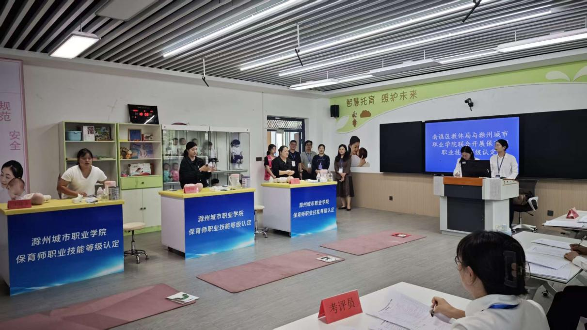 为加强滁州市南谯区职业技能人才培养,筑牢保育师领域人才根基,9月27日,我校与南谯区教体局联合开展保育师职业技能等级认定工作。校党委委员、副校长孙静,滁州市人社局职鉴中心主任姜梦莲到场巡考,继续教育学院院长许梅、副院长孟红军、教育学院副院长刘明辉陪同参加。本次认定全程覆盖专业培训与等级考核,等级为初级,共206名学员参加。教育学院精心选拔了6名考评员参加本次培训与考评。考核分为理论知识和实际操作两个部...