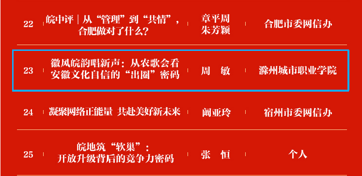 近日,省委网信办正式发布2025“好评安徽”网络评论大赛评选结果,全省共评选出50件优秀作品。我校公共教学部周敏老师撰写的评论作品《徽风皖韵唱新声:从农歌会看安徽文化自信的“出圈”密码》脱颖而出,成功入选优秀作品名单,为公共教学部及学校赢得了荣誉,特此致以热烈祝贺!周敏老师深耕大学语文课程教学与思想文化研究,此次入选作品以农歌会为切入点,紧扣“文化自信”时代主题,深度剖析农歌会如何以“乡土味”承载“文...