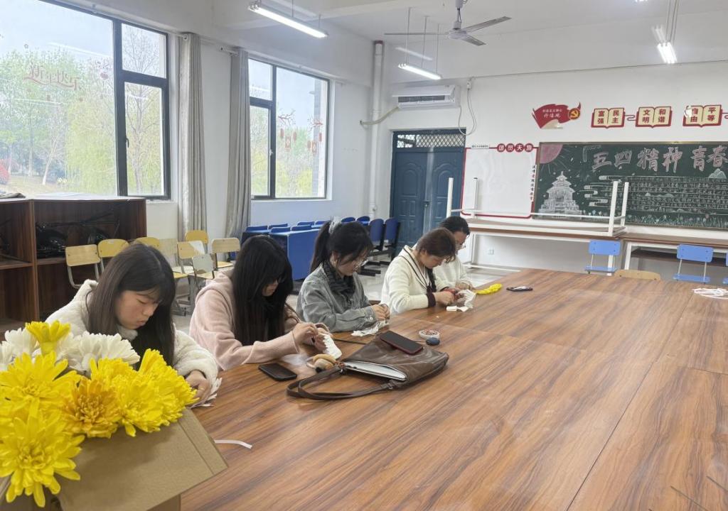“每一层花瓣的褶皱都要自然舒展,就像我们对先烈的感情,要真挚而深沉。”王荣荣书记边示范边讲解。支部教师们将美术课堂搬进党建活动室,把专业技能与党性教育深度融合,让师生在动手实践中感悟传统祭祀文化的当代转化,用艺术创作承载对英烈的追思。经过数小时的精心制作,数朵手工菊花汇聚成束,承载着第二党支部全体师生的敬意与缅怀。